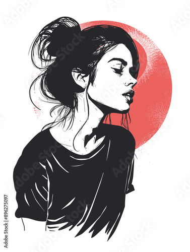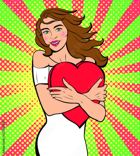 Vektorové ilustrace krásné mladé ženy na sobě červené šaty a kožich. Sexy brunetka pin-up dívka v retro pop art komický styl.