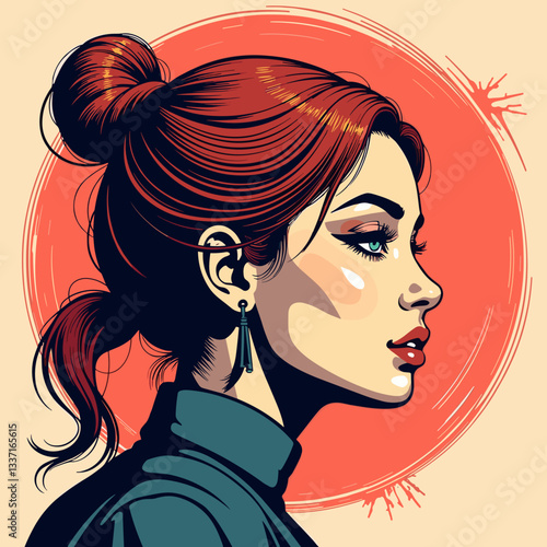 Vektorové pop art krásná žena boční pohled portrét. Zrzavá sexy pin-up dívka v komiksovém stylu.