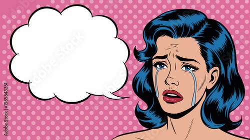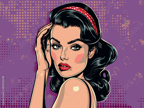 Vektorová ilustrace krásné ženy, která dostává bolesti hlavy nebo stresovanou mladou dívku v retro komiksovém stylu pop art.
