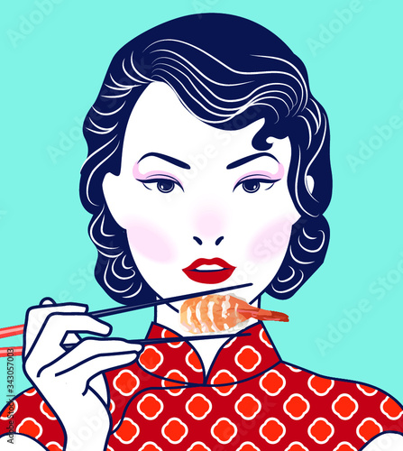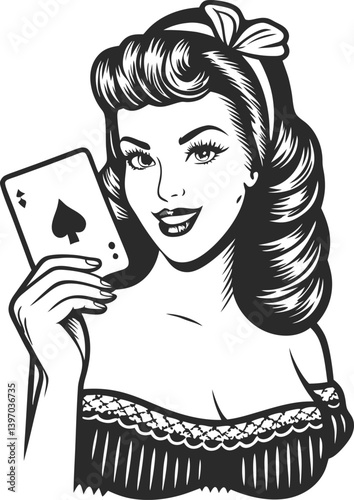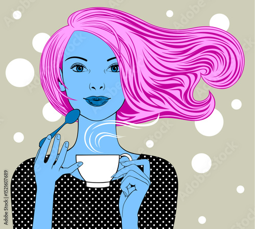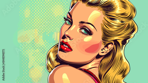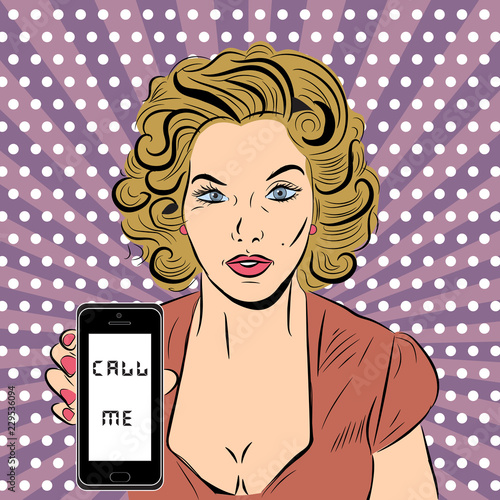 Vektorové ilustrace mladé ženy, která drží prázdnou kartu. Krásná dívka portrét v retro pop art komické stylu.