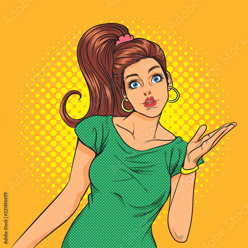 Vektorová ilustrace krásné ženy držící smartphone s lidskou rukou ukazující prstem gesto ruky. Retro pop art komický styl.