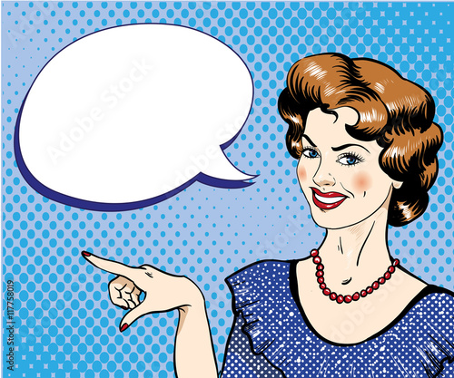 Vektorové ilustrace krásné mladé ženy s otevřenou dlaní. Dívka ukazuje mrak s fidget spinner stres-uvolňující symbol hračky v pop art retro komiksovém stylu.