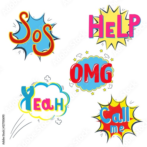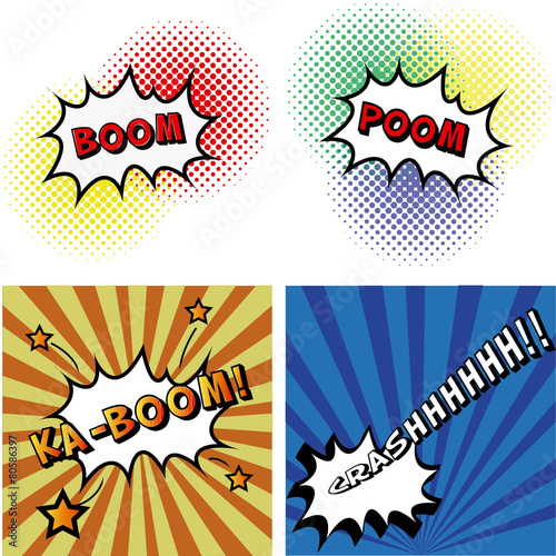 Vektorové vintage pop art komické řeči a exploze bublina set s módní fráze a výrazy Bang, Zap, Wham, Bam.