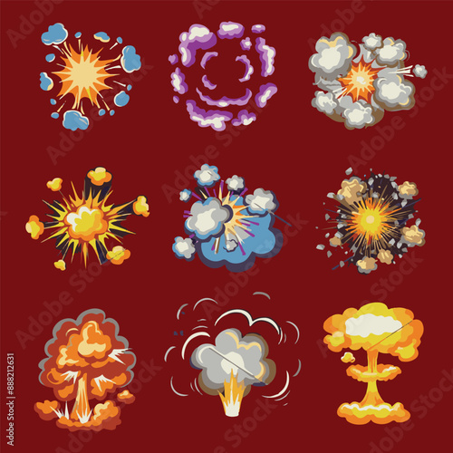 Vektor vintage pop art exploze efekt animace set. Komiksový styl.