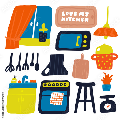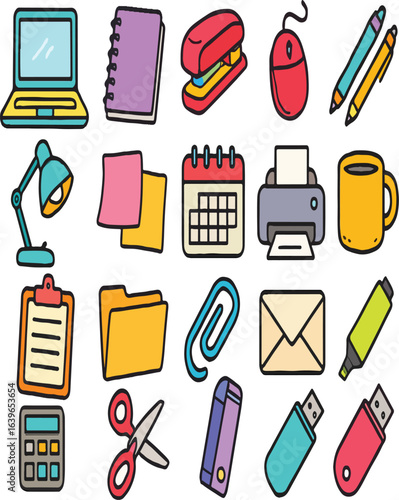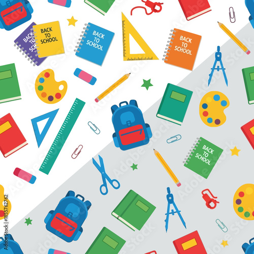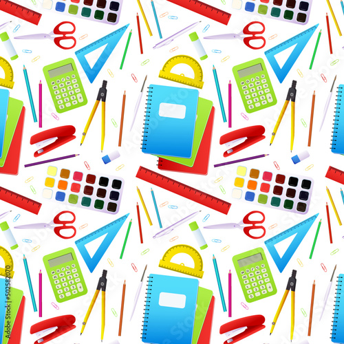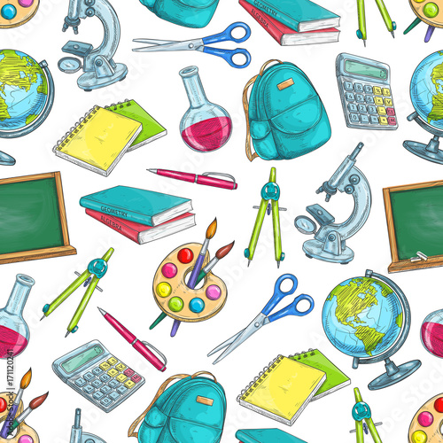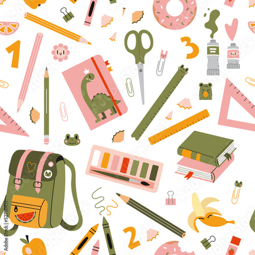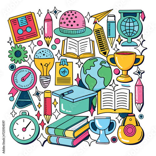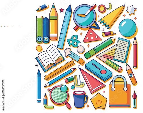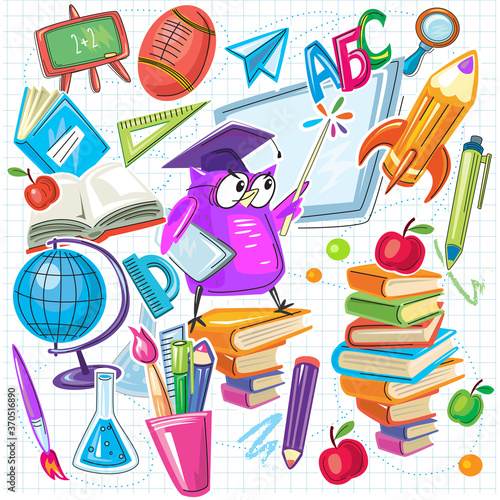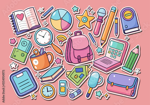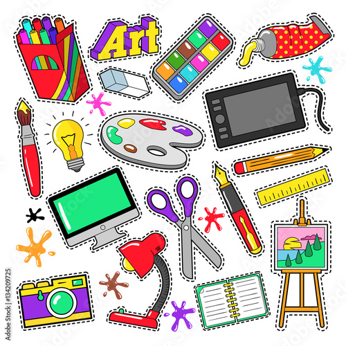 Vektorové pop art comic style módní školní záplaty, samolepky sada s perem, tužkou, batohem, nůžkami, brýlemi, kalkulačkou, barvami, lepidlem, Lupe pravítkem a botami.