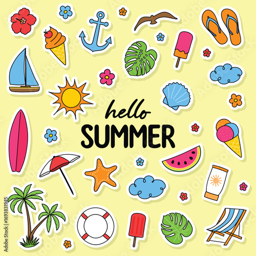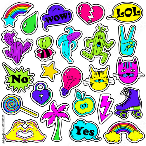Vektorové vintage pop art záplaty a samolepky sada s koblihy, jablko, plátek melounu, citron, kaktus, červ, koruna, luk, Srdce, Žena oční rty, boty a ahoj řeč bublina.