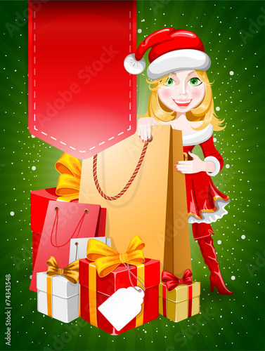 Vektorová ilustrace krásné dívky v kostýmu Santa Clause, která drží dárkovou krabici. Veselé Vánoce a Šťastný Nový rok koncept v retro pop art komické stylu.
