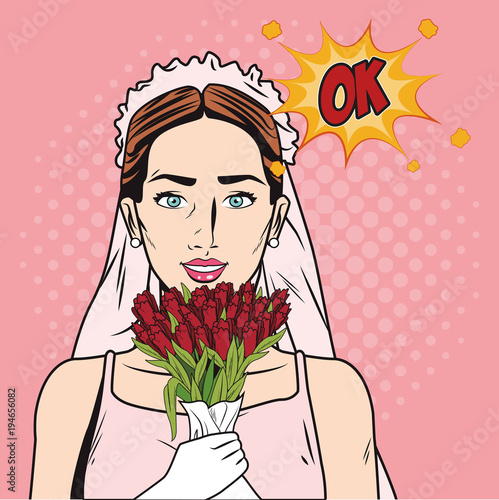 Vektorová ilustrace mladé ženy s květinovou kyticí stojící zpět. Plakát květinářství v retro pop art komickém stylu.