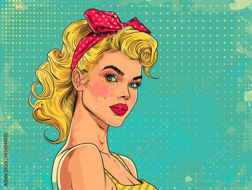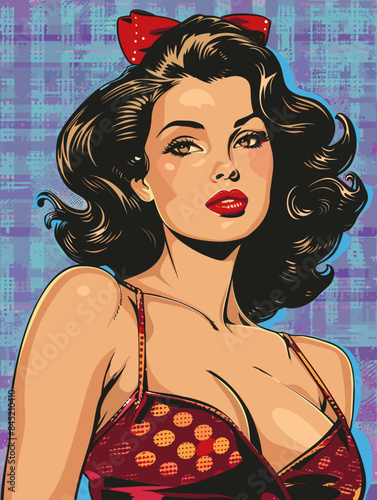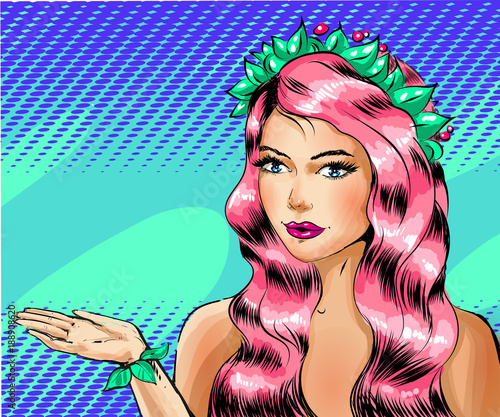 Vektorová ilustrace krásné ženy s listovým věncem a náramkem. Sexy romantická pin-up dívka s růžovými vlasy v retro pop art komickém stylu.