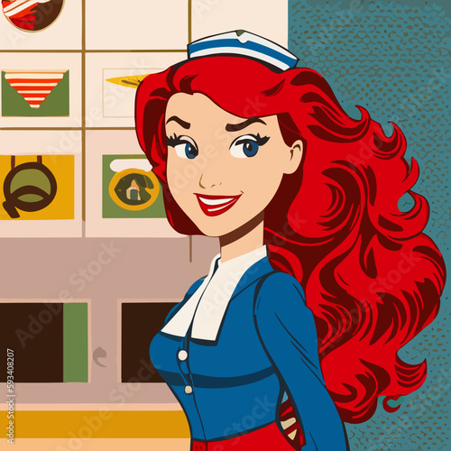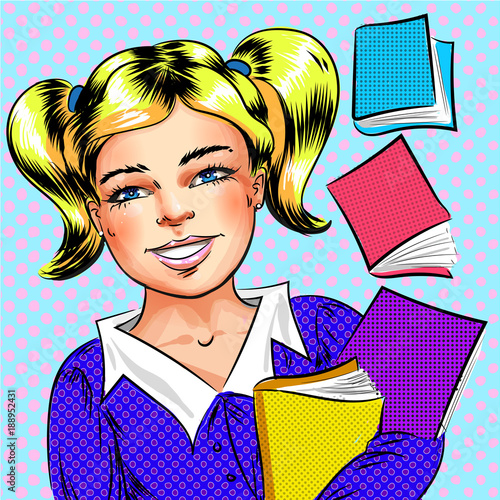 Vektorová ilustrace šťastné dívky, která drží knihy v ruce. Školačka portrét v retro pop art komické stylu.
