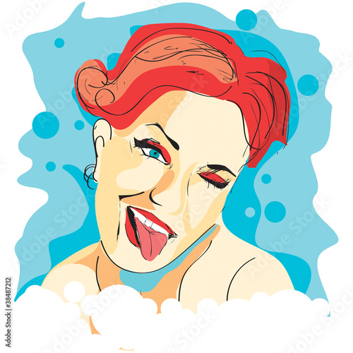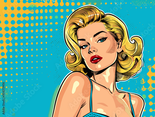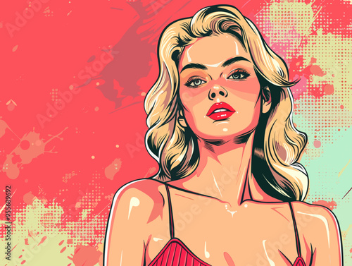 Vektorové ilustrace krásné blond ženy s chutnou zmrzlinou. Pin-up dívka portrét v retro pop art komické stylu.