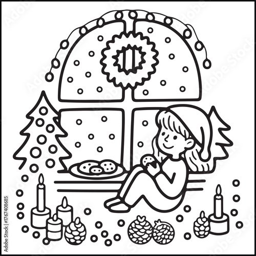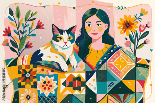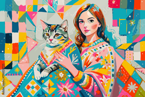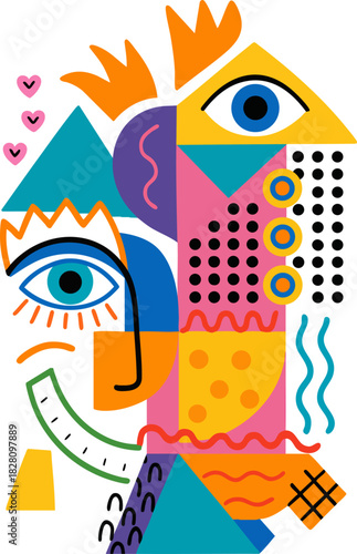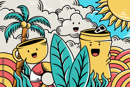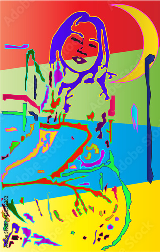 Vektorová ilustrace holčičky sedící u stolu a malování slunce v jasně žluté barvě, retro pop art komický styl.