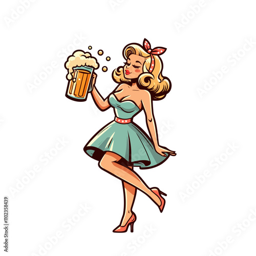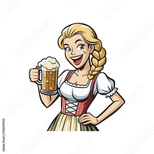 Vektorová ilustrace hezké dívky servírky s pivem a rybami. Koncept pivního festivalu Oktoberfest v retro pop artovém komiksovém stylu.