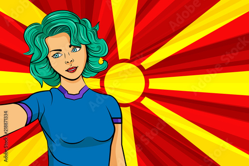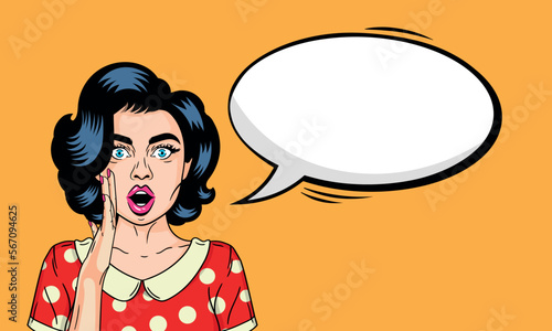 Vektorová ilustrace šťastné krásné ženy, která v ruce drží červené srdce. Romantická dáma v lásce, retro pop art komický styl.