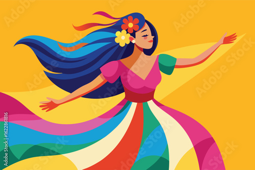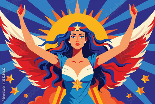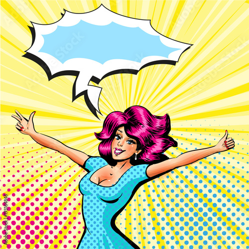 Vektorová ilustrace krásné usměvavé dívky s nataženýma rukama, řečová bublina. Šťastná žena ukazující palec nahoru a ruční znamení třemi prsty v retro pop art komickém stylu.