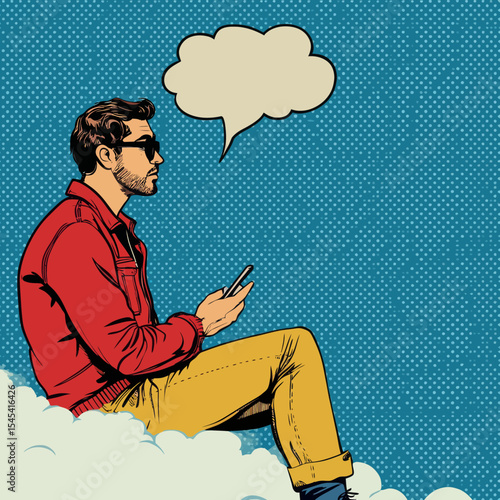 Vektorová ilustrace smutného muže mluví po telefonu, bublina řeči. Rozrušený muž v retro pop artovém komiksovém stylu.