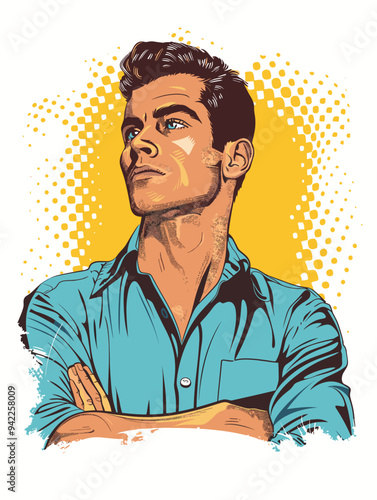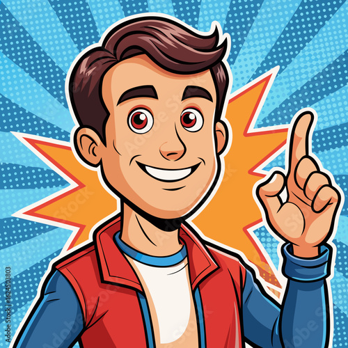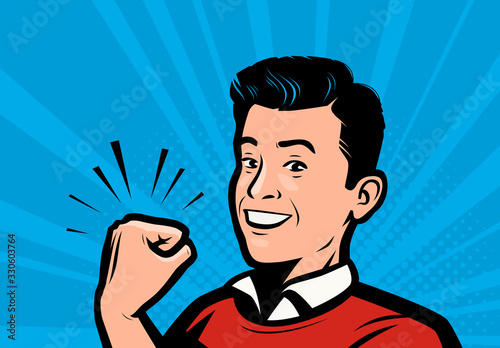 Vektorová ilustrace šťastného mladého muže ukazující ILYOVO znamení ruky, řečová bublina. Pohledný muž s I Love You gesto v retro pop art komické stylu.