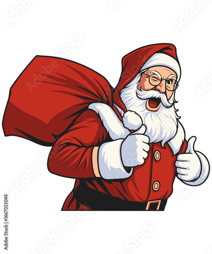 Vektorové ilustrace Santa Claus v červeném kostýmu ukazuje velkou sněhovou kouli. Veselé Vánoce a Šťastný Nový rok koncept v retro pop art komické stylu.