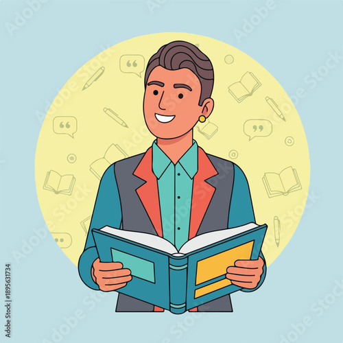 Vektorová ilustrace školáka sedícího u stolu s otevřenou knihou. Chytrý žák se zvednutou rukou připraven odpovědět na otázku. Zpět na školní plakát v retro pop art komickém stylu.