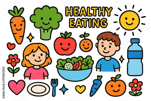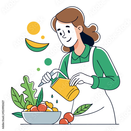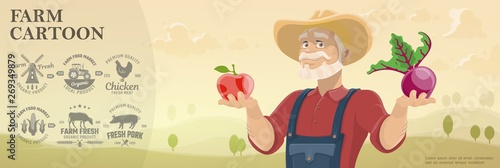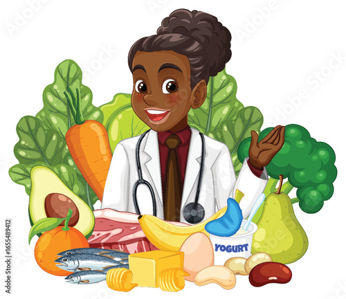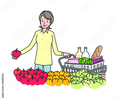 Vektorová ilustrace krásné ženy ukazující na ovoce a zeleninu na policích v retro pop art komickém stylu.