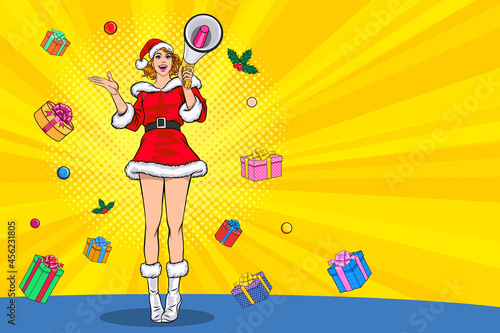 Vektorová ilustrace běžící podnikatelky na sobě červený plášť. Retro pop art komiksová dívka v kostýmu superhrdiny, létající papírové peníze, řečová bublina.