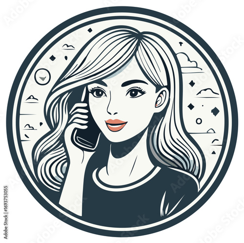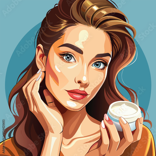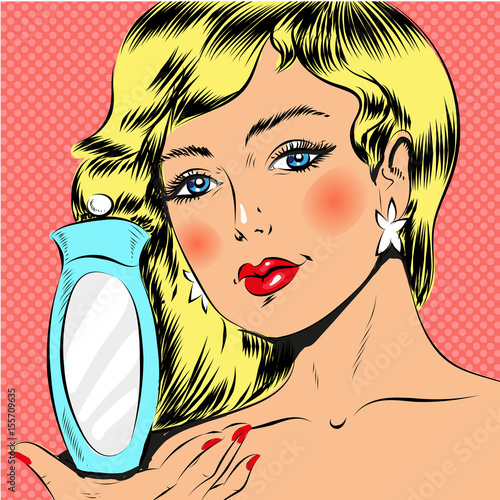 Vektorové ilustrace krásné ženy, která drží láhev parfému. Pin up blondýnka v retro pop art komický styl.