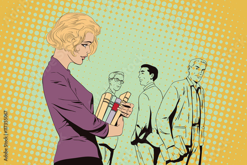 Vektorová ilustrace mladé ženy s ukazatelem dává prezentaci, řeč bublina. Obchodní workshop, školení, konference, koncept přednášky v retro pop artovém komiksovém stylu.
