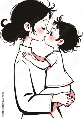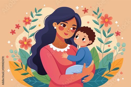 Vektorová ilustrace mladé ženy a milující matky, která drží své dítě. Den matek pohlednice v retro pop art komické stylu.