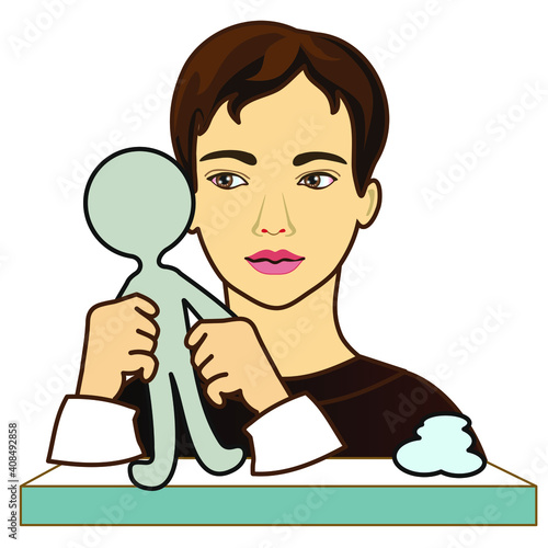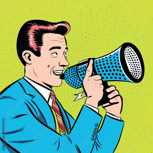 Vektorová ilustrace pohledného muže stisknutím velkého červeného tlačítka v retro pop art komickém stylu.