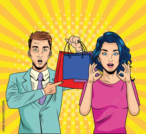 Vektor pop art muž ve slunečních brýlích drží kreditní kartu. Komiks vintage ilustrace.