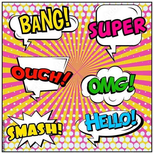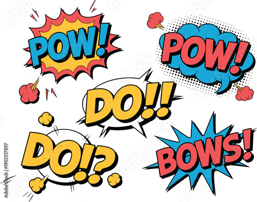 Vektorová sada vintage pop art záplat, samolepky a bubliny s módními frázemi a výrazy Jo, Ach, Bam, Wow, Pop, Cool, nový. Komiksové zvukové efekty.