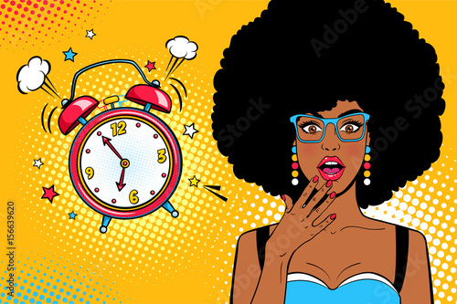 Vector pop art krásná dívka s budíkem. Šokovaná žena kvůli probuzení pozdě ráno, bublina řeči, retro komiksová ilustrace.