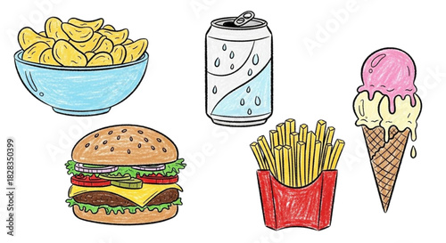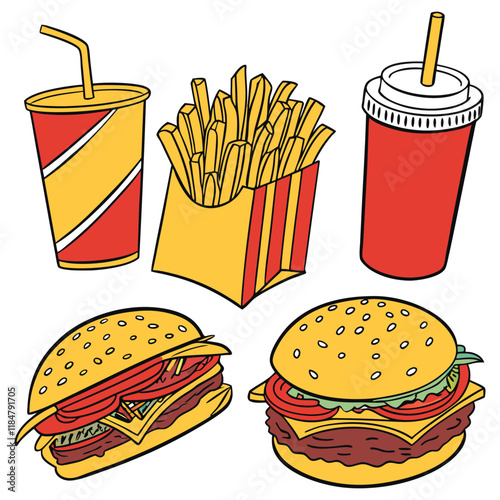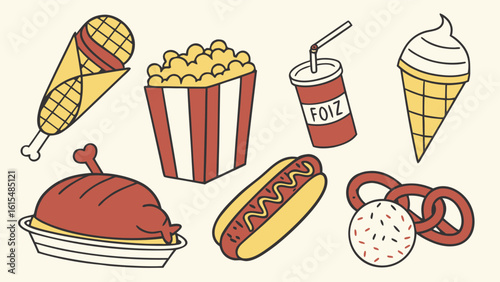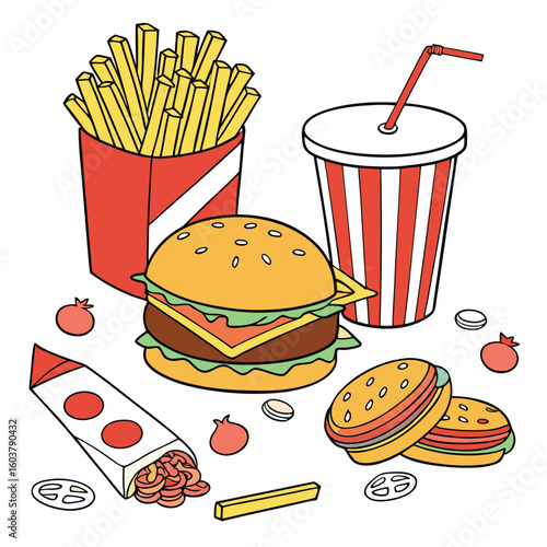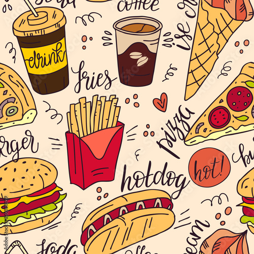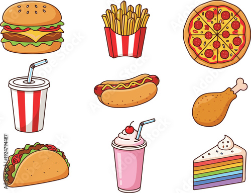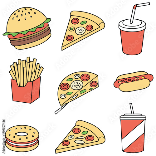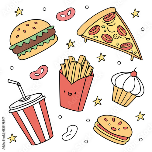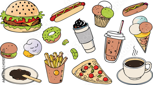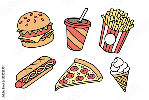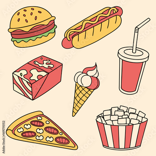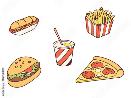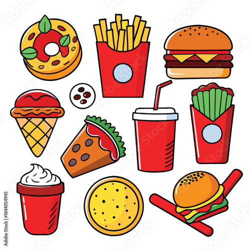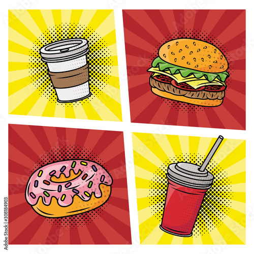 Vector trendy cool sada fast food záplaty, odznaky. Zmrzlina kužel, kobliha, hranolky, káva, hamburger, pizza, popcorn, párek v rohlíku a cola v retro pop art komické stylu.