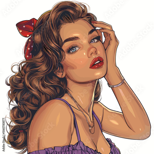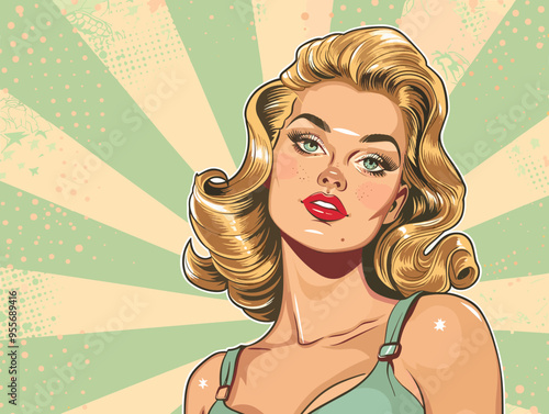 Vektorová ilustrace usmívající se mladé dívky ukazující znamení nebo gesto vítězství nebo míru. Krásná pin-up dívka gestikulující v retro pop art komiksovém stylu.