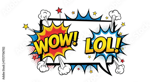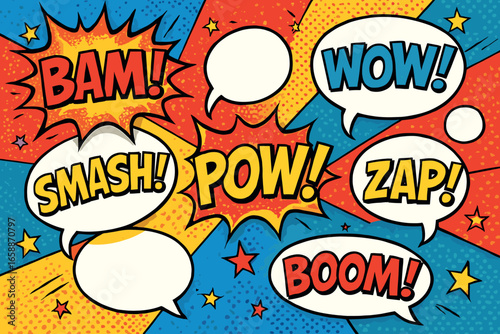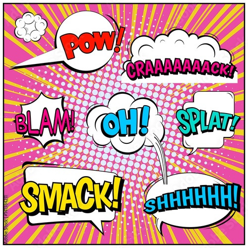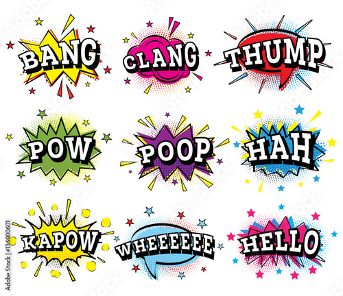 Vektorový vintage pop art komický projev a exploze bublina set s nejpoužívanějšími slovy a zkratkami Ohh, to jo, prodej, třesk, Booom, Páni, Ooops, procento a další znaky.