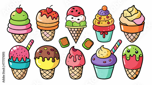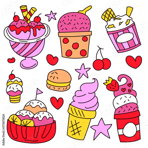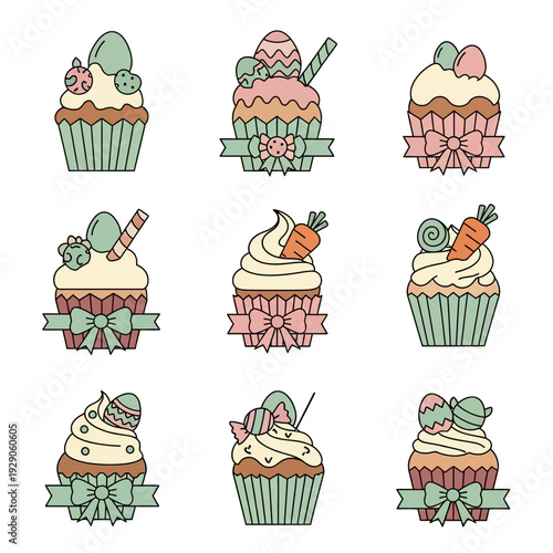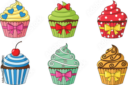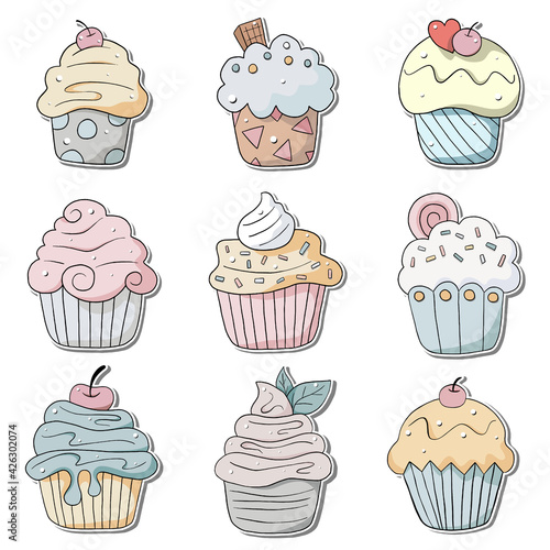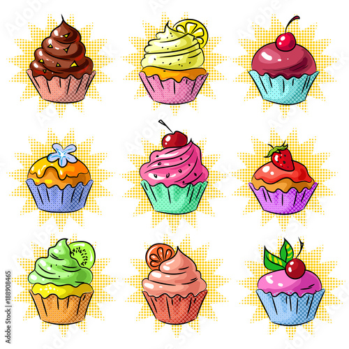 Vektorové pop art delicious cupcake set. Čokoláda, ovoce, vanilkové muffiny vintage skica styl ilustrace. Chutné cupcake záplaty, kolekce samolepek.