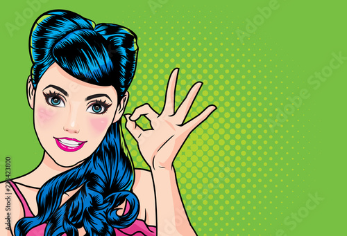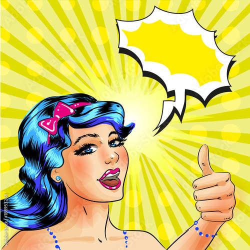Šťastná mladá žena ukazuje palec nahoru gesto ruky, řeč bublina. Vektorová ilustrace v retro pop art komickém stylu.