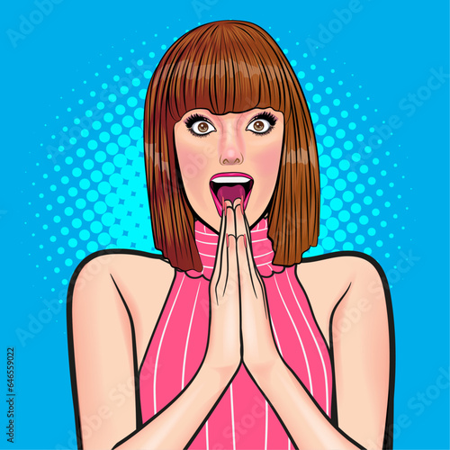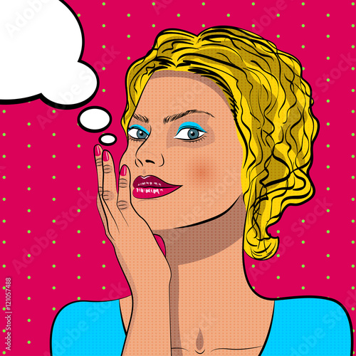 Vektorová ilustrace krásné pin-up wonder girl, řečová bublina v retro pop art komickém stylu.