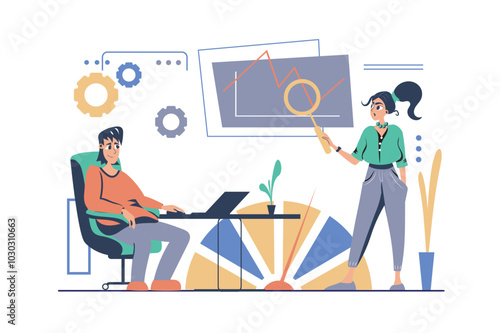 Vektorový plakát obchodních prezentací a setkání bannerů. Koncept týmové práce. Plochý design podnikatelů nebo kancelářských pracovníků. Interiér kanceláře.