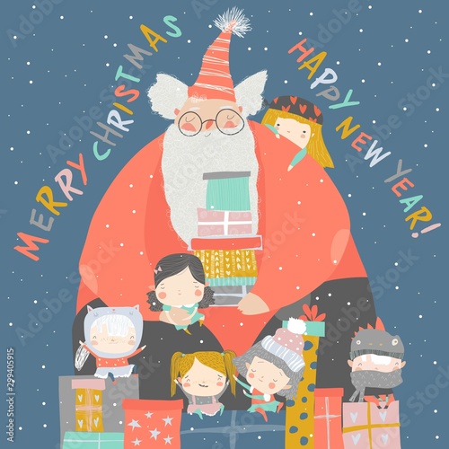 Vektorový plakát s prodejem na všechny aplikace nápisy. Santa Claus ukazuje dárek na mobilním telefonu s ukazováčkem. Vánoční prodej koncept ilustrace.