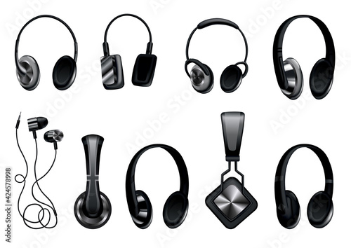 Vektorová sada bezdrátových a kabelových sluchátek, sluchátek. Realistická Černá sluchátka Hudební příslušenství izolovaných na bílém pozadí.