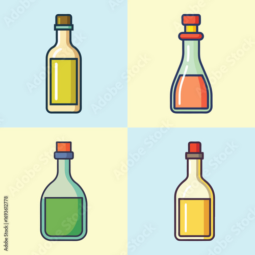 Vektorová sada realistických skleněných lahví a sklenic na olivový olej izolovaných na bílém pozadí. Šablony balení olivového oleje. Olivový olej produkt ad.