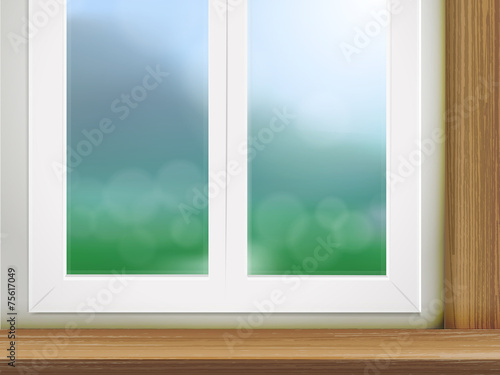 Vektorová sada realistických uzavřených bílých plastových oken a modré denní oblohy a měsíční noční oblohy mimo ně. Realistické ilustrace izolovaných na bílém pozadí.