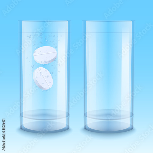 Vektorové realistické bílé rozpustné tablety set. Dvě šumivé tablety s bublinkami a pilulkou rozpouštějící se ve sklenici vody na průhledném pozadí.
