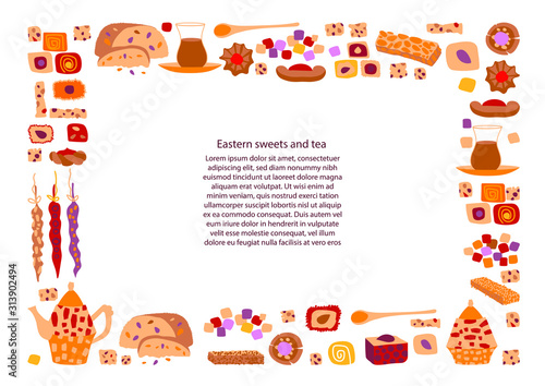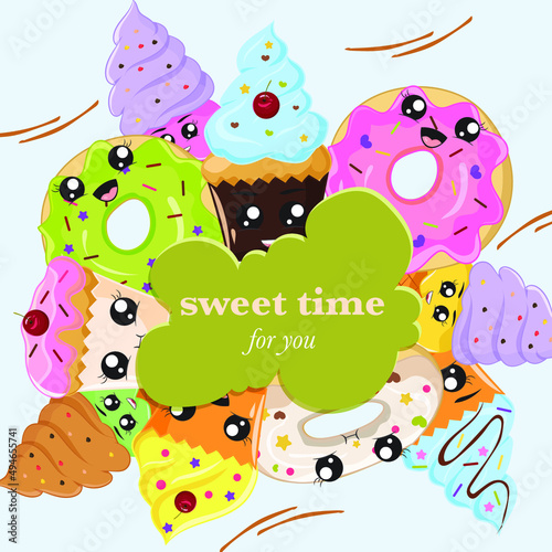 Vektorové bezešvé vzor se sladkými dezerty. Chutné pečivo a pekařské zboží. Muffin, dort, kobliha, sušenka s čokoládou, oplatka, preclík, francouzský croissant a koláč. Horizontální bezešvé hraniční vzor.