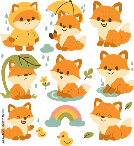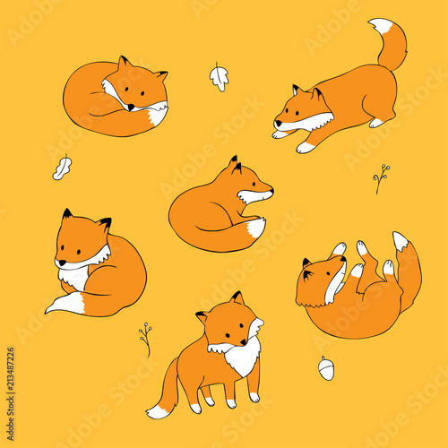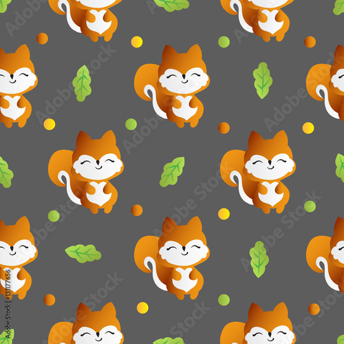 Vektorové bezešvé vzor s roztomilé lišky drží květiny, spí, poslouchá hudbu. Legrační zvířata pozadí, tapety, tkanina, balicí papír.