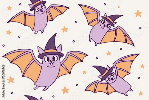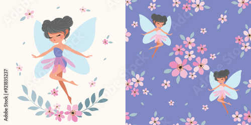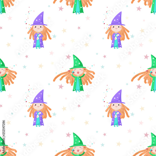 Vektorové bezešvé vzor s roztomilé holčičky, mýtické bytosti a pohádkové postavy dělat kouzlo s kouzelnou hůlkou a lektvar. Dětské kouzelnice pozadí, tapety, tkanina, balicí papír.