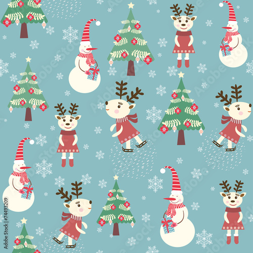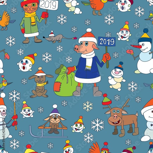 Vektorové bezešvé vzor s roztomilá zvířata medvěd, mýval a sova těší lyžování. Zimní pozadí, tapety, tkanina, balicí papír.