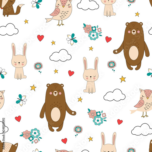 Vektorové bezešvé vzor s roztomilou veverka a ježek, jarní květiny a ptáky. Legrační jarní Zvířata pozadí, tapety, tkanina, balicí papír.