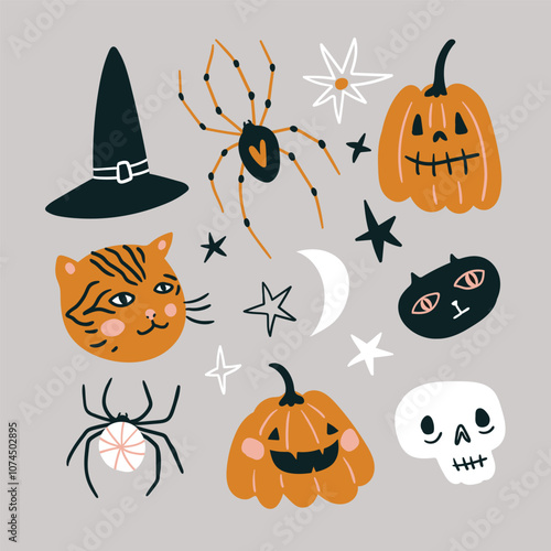 Vektorové bezešvé vzor s Halloween symboly dýně, cukr lebka maska, oko, netopýr, svíčka, cukroví kuří oka, pavouk, lidská lebka, javorový list a čarodějnice klobouk. Halloween dovolená pozadí tapety zábal atd.